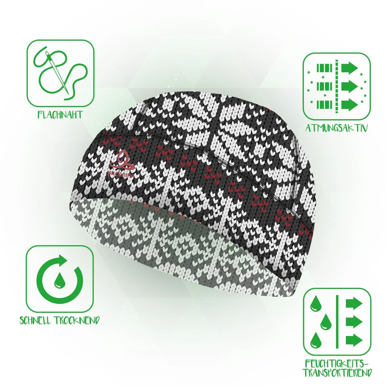 Der Hat der Marke pachama ist zu 100% aus hochwertigem Polyester gefertigt. Diese funktionale Mütze verfügt nur über besonders wenige flache Nähte, wodurch ein angenehmeres Tragegefühl entsteht. Ebenso wird Feuchtigkeit ideal abtransportiert und die Mütze ist nicht nur atmungsaktiv sondern hemmt außerdem die Geruchsbildung, weil sie antibakteriell ist. Ein weiterer großartiger Vorteil ist die schnelle Trocknung.